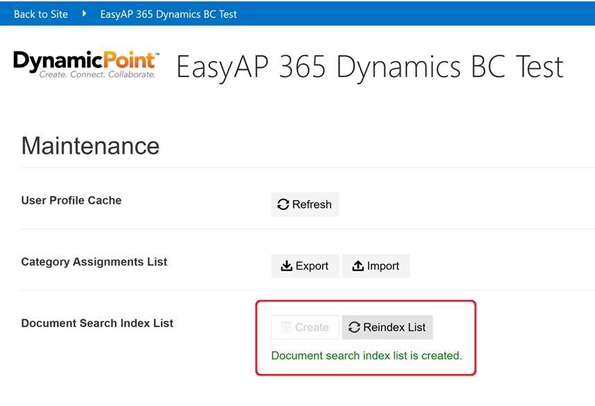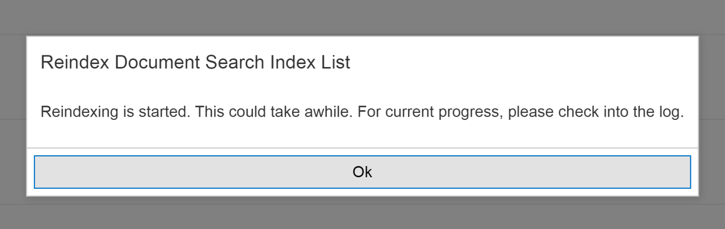 Pressing ‘Reindex List’ button will make attempt to start the reindexing operation. Informational dialog will appear to inform you if execution is successfully started or not. On successful starting, operation will be processed in the background. The current progress of the operation can be followed in the log.