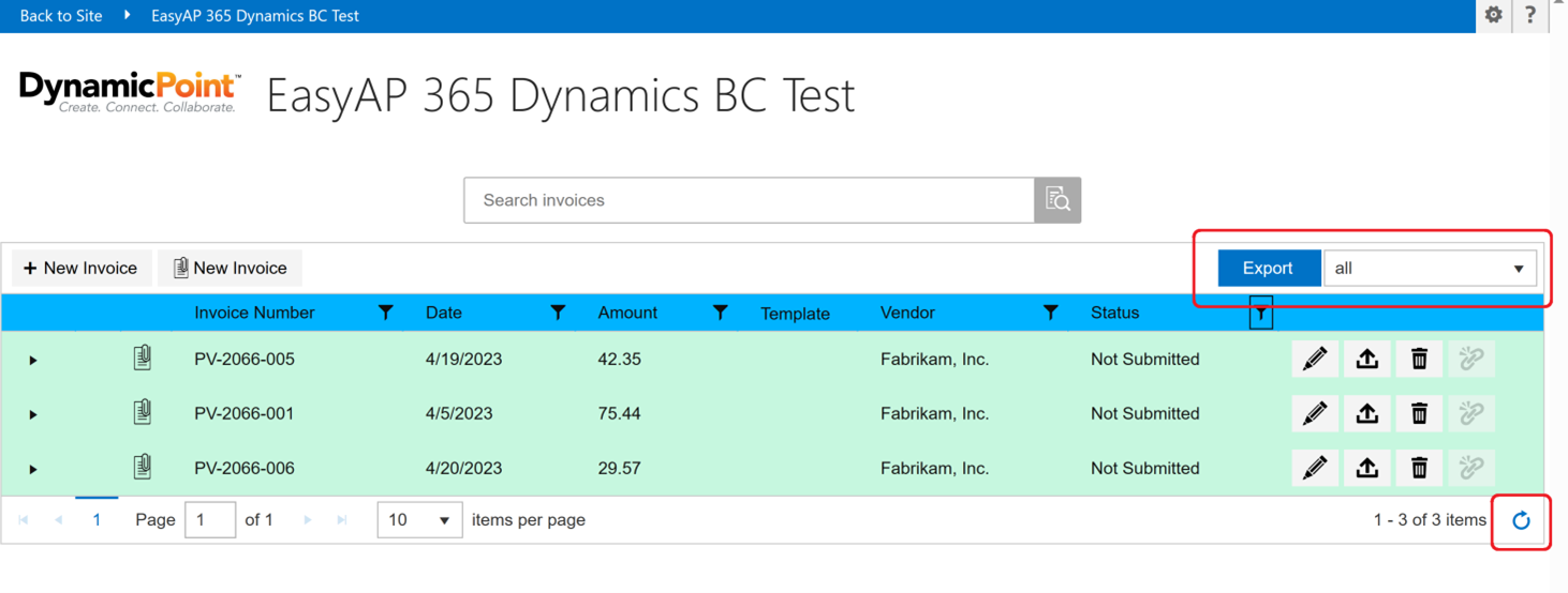 The search control is fully compatible with the invoice grid functionality. In other words, the date filter, export and refresh functionality will work accordingly to the search query entered in the search control.