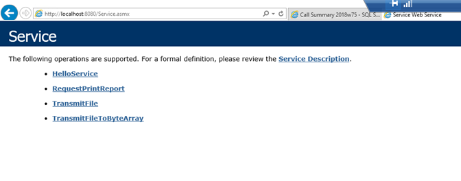 - Test the service by navigating to the url of the service in a browser. The url is a combination of the binding for the target web site and /Service.asmx. For instance: http://localhost:8989/Service.asmx?wsdl or http://localhost:8989/Service.asmx This uses port 8989 in the example but whatever port you used to set up in IIS Configuration Step 3 is what you will use here. When you see this come up locally you know you have set up the report server correctly.