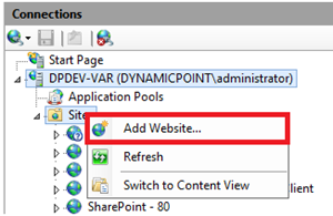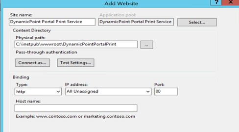 - Specify the site name, physical folder, and bindings for the new site: Use port 8989 if available as DynamicPoint standard internally and 8990 for external access. Let administrator at client know we are using that port.