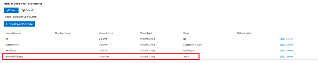 By default, the report service anticipates a pdf file format. If an Excel report generation is desired, the following parameter must be added to the report service configuration. Parameter name “Internal.FileType” of type Constant, value should be .XLSX